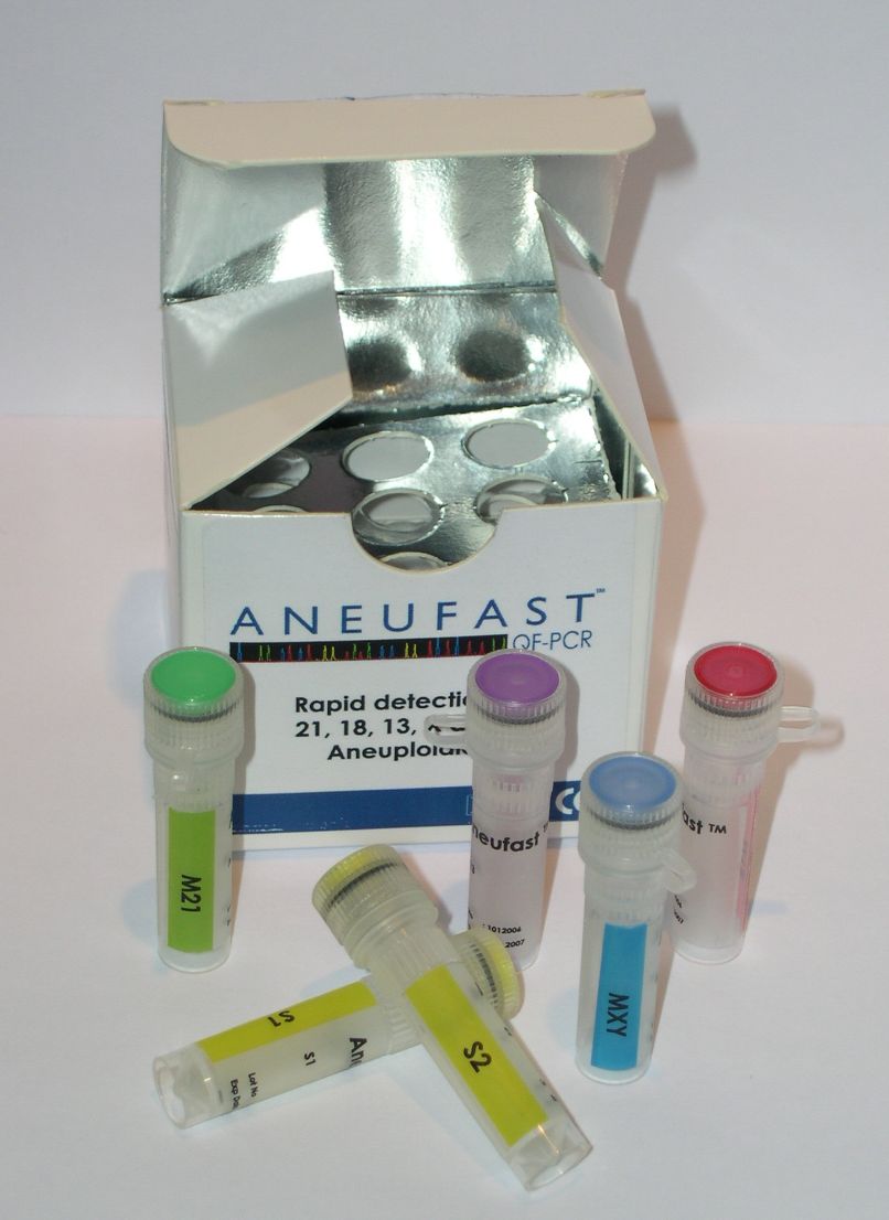 The Aneufast™ QF-PCR Kit uses a five-dye fluorescent system for automated DNA fragment analysis. This allows multiplex amplification and electrophoresis of over fifteen loci simultaneously. The kit is intended for use on Applied Biosystems ABI PRISM® genetic analysis instrumentation. Fluorochromes include 6-FAM™, VIC™, NED™ and PET™ to be used in conjunction with GS 500 LIZ™ size standard (Applied Biosystems PNº 4322682)